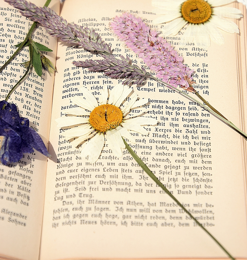 Nun legt ihr die Blüten vorsichtig zwischen Zeitungspapier oder Löschblätter in ein dickes Buch. Bitte unbedingt darauf achten, dass die Blütenblätter schön geordnet und glatt gestrichen sind. Anstelle der Löschblätter könnt ihr auch einfaches Zeitungspapier nehmen. Zum Pressen der Blumen verwende ich am liebsten alte Bücher, da die Pflanzen durch den Trocknungsprozess Feuchtigkeit abgeben und sich dadurch die Blätter wellen können. Nun stapelt ihr auf das Buch mit den eingelegten Blumen weitere dicke, schwere Bücher. Zur Beschleunigung des Trocknungsprozesses könnt ihr das Löschpapier nach einigen Tagen vorsichtig wechseln. Nach zwei bis drei Wochen sind die Blumen dann getrocknet.