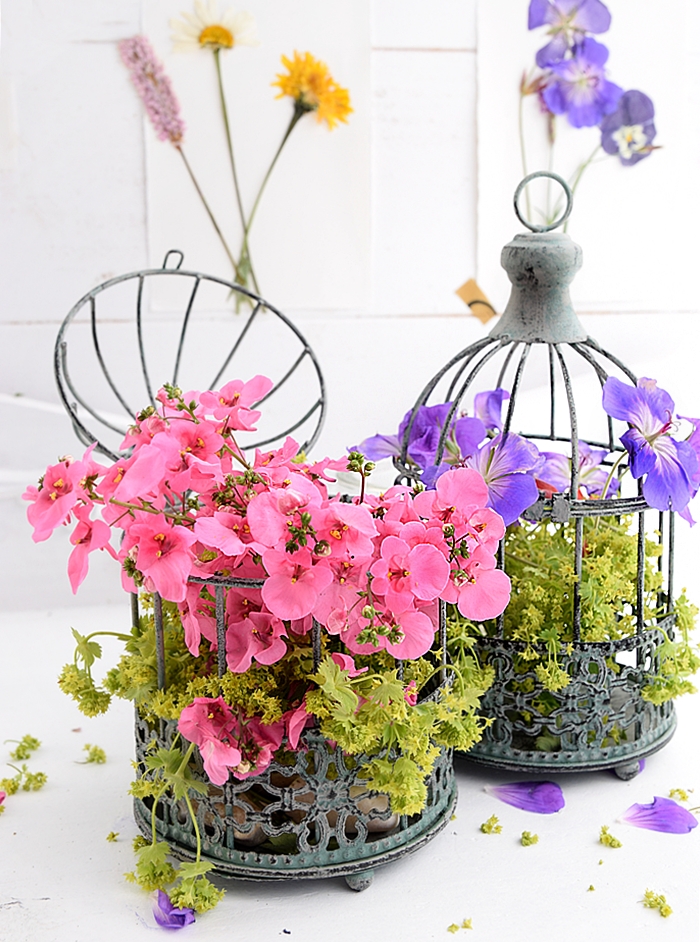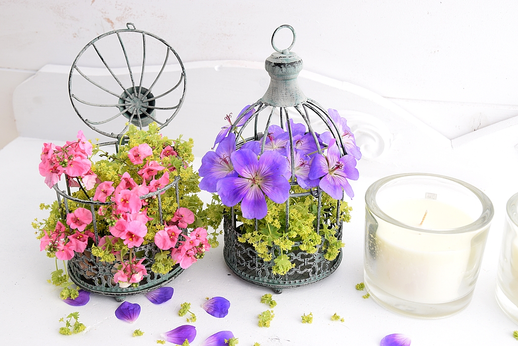 Gelb blühender Frauenmantel und blau-violetter Wiesenstorchschnabel umspielen romantisch diesen kleinen Vogelkäfig.