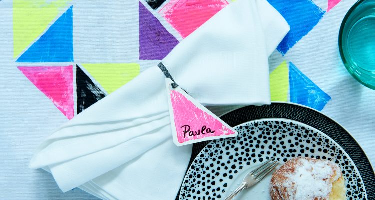 - Für ein stimmiges Bild kannst du auch geometrische Formen auf Pappe stempeln, trocknen lassen und ausschneiden. Diese kannst du zum Beispiel um Servietten oder Gläser binden oder aber kleine Platzschildchen basteln. Super sind auch Stoffservietten im gleichen Muster.
