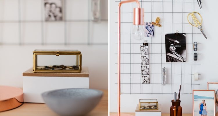 Wer mag kann das Gitter zum Schluss noch mit einem Sprühlack farblich verändern. Dabei sind der Fantasie keine Grenzen gesetzt. Auf dem Gitter könnt ihr nun nach Lust und Laune Notizen, Erinnerungsfotos, Moodboards, Inspirationen und Arbeitsutensilien dekorieren und anbringen. Der DIY Organizer ist eine richtige Augenweide und macht auf jedem Schreibtisch was her!