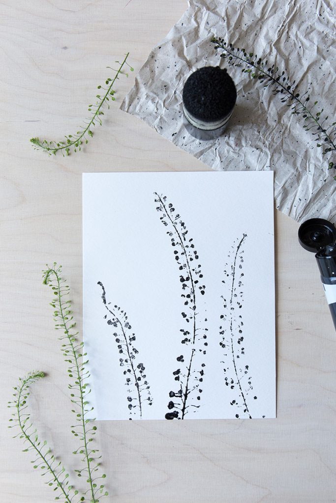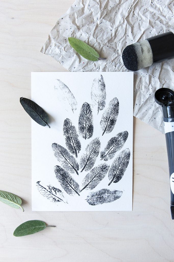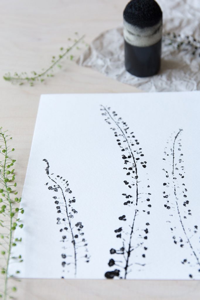- Die mit Farbe versehenen Naturstempel mit leichtem Druck auf das Papier drücken. Bei feinen Pflanzen, die sich nicht so leicht mit den Händen gleichmäßig auf das Papier aufdrücken lassen, einfach ein zweites Blatt Papier zur Hilfe nehmen. Dieses auf die Pflanze legen und dann mit der kompletten Handfläche aufdrücken, so entsteht eine Art Presse.