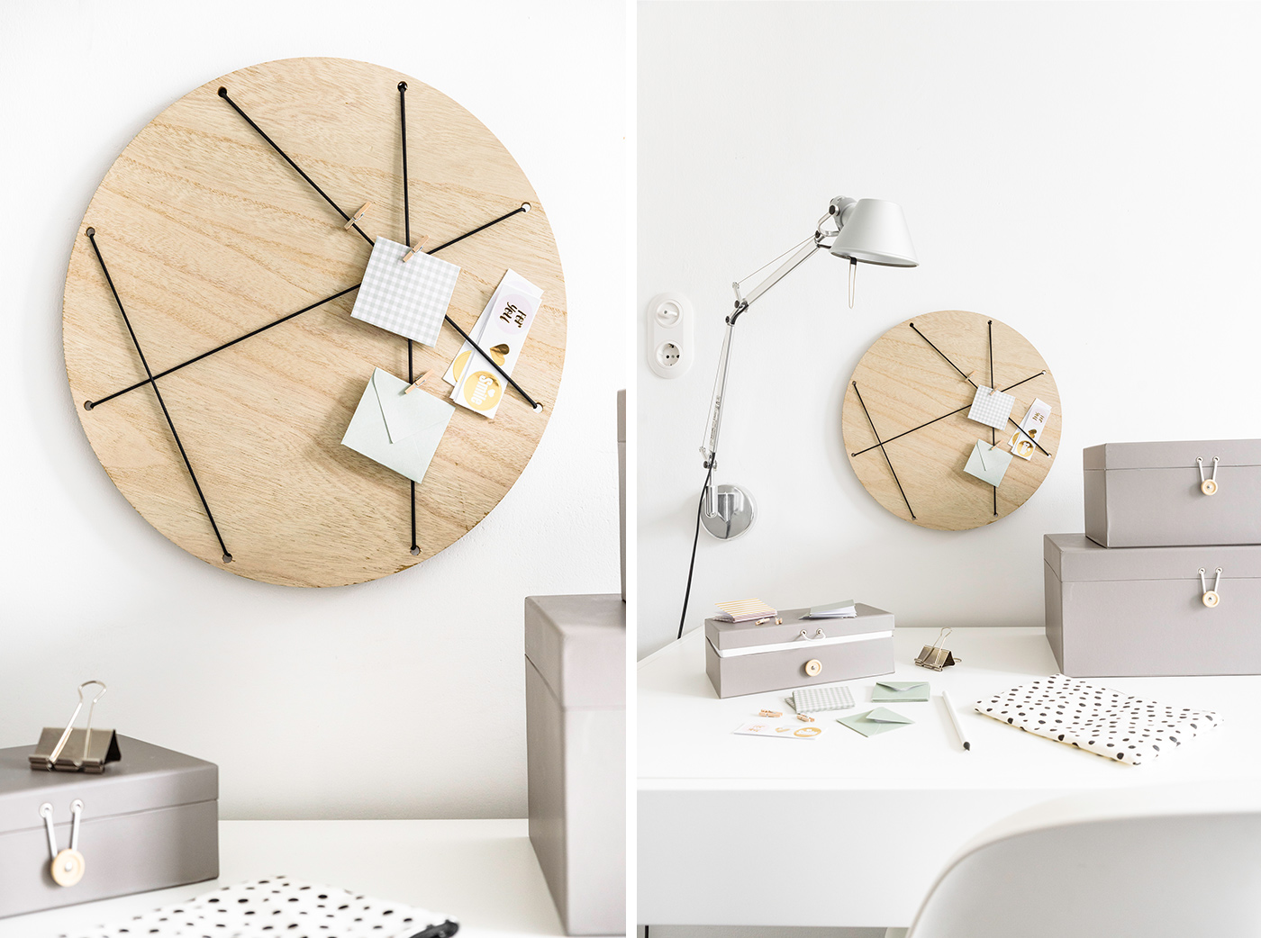 Meine Pinnwand für mein Homeoffice habe ich aus einem Dekotablett von DEPOT gebaut. Der Kreis und das Material passte so gut zu den kleinen Knopfverschlüssen an den Schachteln.