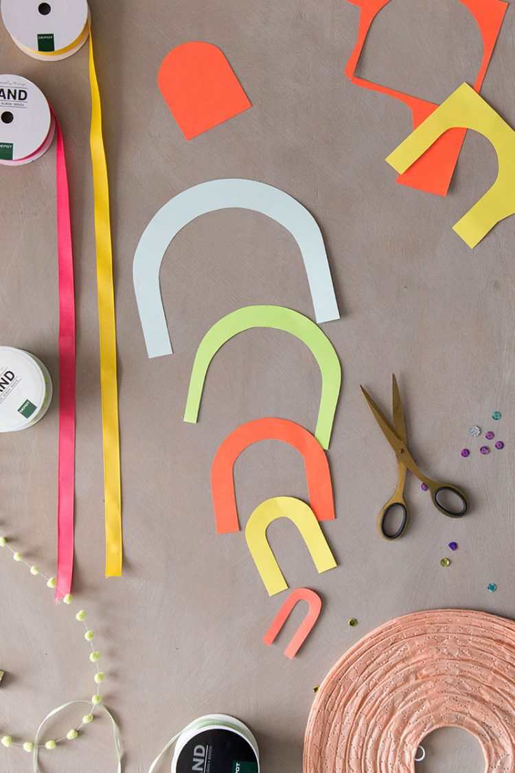 - Die Bänder auf beiden Seiten des Regenbogens geichmäßig mit Heißkleber an den unteren Enden des Regenbogens festkleben.