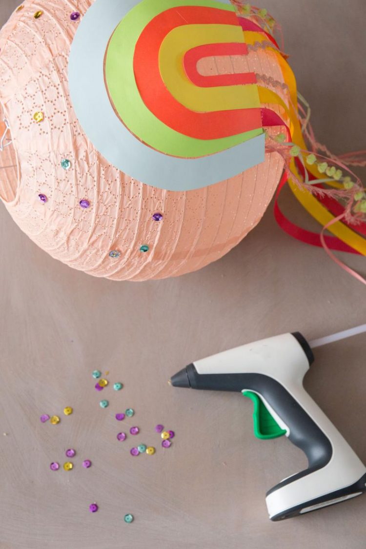 - Danach die DIY Laterne noch mit Pailletten und Pompons verzieren. Dafür diese einfach mit Heißkleber auf dem Lampion festkleben.