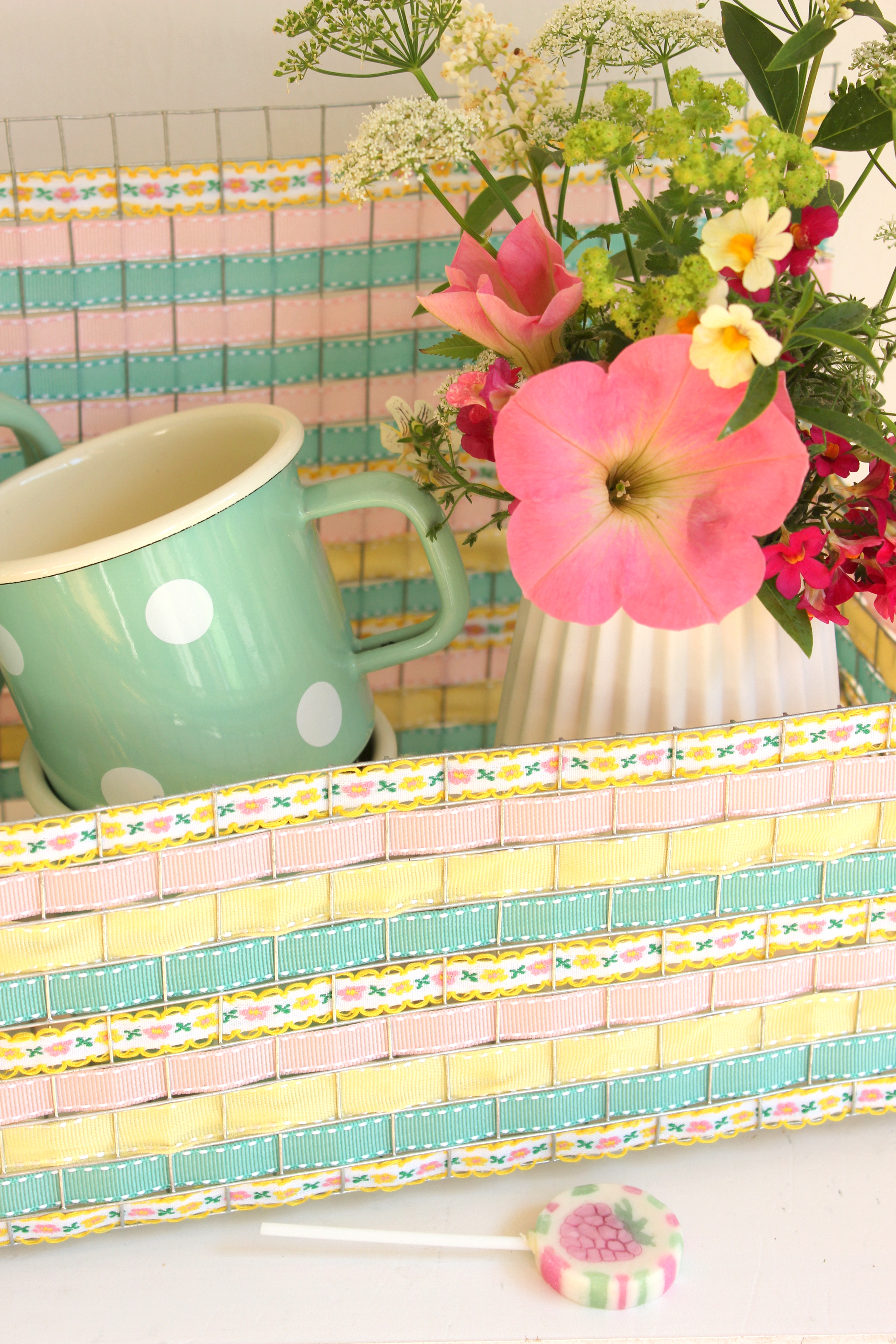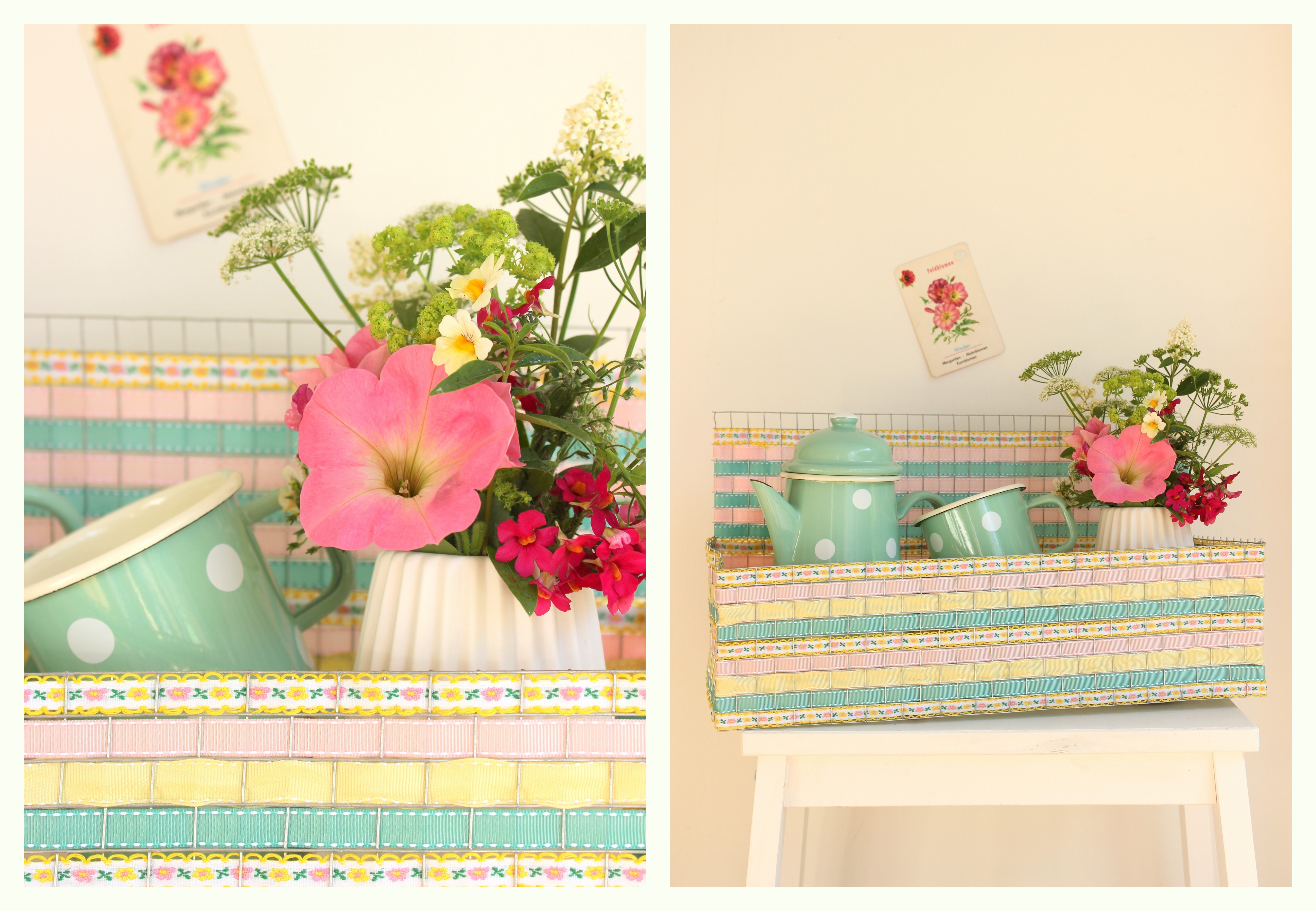 Bei einem Bummel durch den Baumarkt findet man die tollsten Materialien, um daraus individuelle Dekoration für das eigene zu Hause herzustellen. Diesmal ist mir der Hasendraht in die Hände gefallen. Es ist erstaunlich was man daraus alles machen kann. Nein, ich habe keine Kaninchen, aber viel Krimskrams, der untergebracht werden will. Daher zeige ich Euch, wie ihr aus diesem Draht ein praktisches Regal basteln könnt. Es ist ein Allrounder und findet überall sein Plätzchen, sei es bspw. draußen am Gartenhäuschen für Blumen und Werkzeug oder drinnen im Kinderzimmer und in der Küche. Es ist fast überall einsetzbar und ziert dort die Wand. Da wir gerade Sommer haben, spielen Farben und schöne Stoffe bei mir eine große Rolle. Leichtigkeit und Frische ziehen durch sie ins Haus ein. Mit ein paar bunten Bändern pimpt ihr das Regal noch mal auf und gebt ihm ein individuelles Aussehen, was es kein zweites Mal gibt!