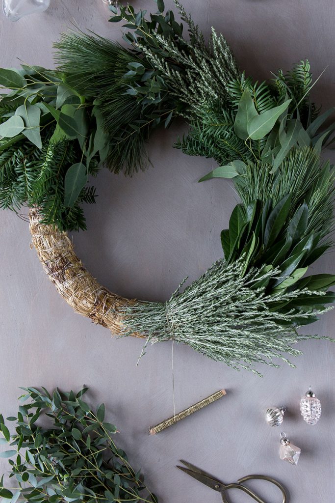 - Danach wird das nächste Bindegrünbündel so aufgelegt, dass die Stiele vom vorherigen gut abgedeckt sind. Wieder mit dem Draht fest die Stiele umwickeln. Den Schritt wiederholen, bis der DIY Adventskranz komplett rund gebunden ist. Tipp: darauf achten, dass die Innen- und Außenseite des Kranzes gut durch das Bindegrün bedeckt sind und der Kranz überall gleichmäßig dick ist.