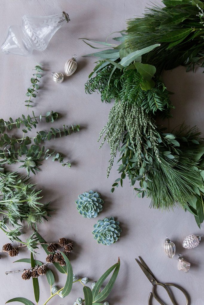 - Dann den Kranz noch mit ein paar Greenery Highlight verzieren. Ich habe hier Mini-Sukkulenten und Eukalyptuskapseln verwendet. Dazu noch ein paar Lärchenzweige. Die Zweige einfach unter das Bindegrün schieben. Die Sukkulenten lassen sich super mit Haarnadeln befestigen und müssen nur ab und zu mit etwas Wasser besprüht werden.