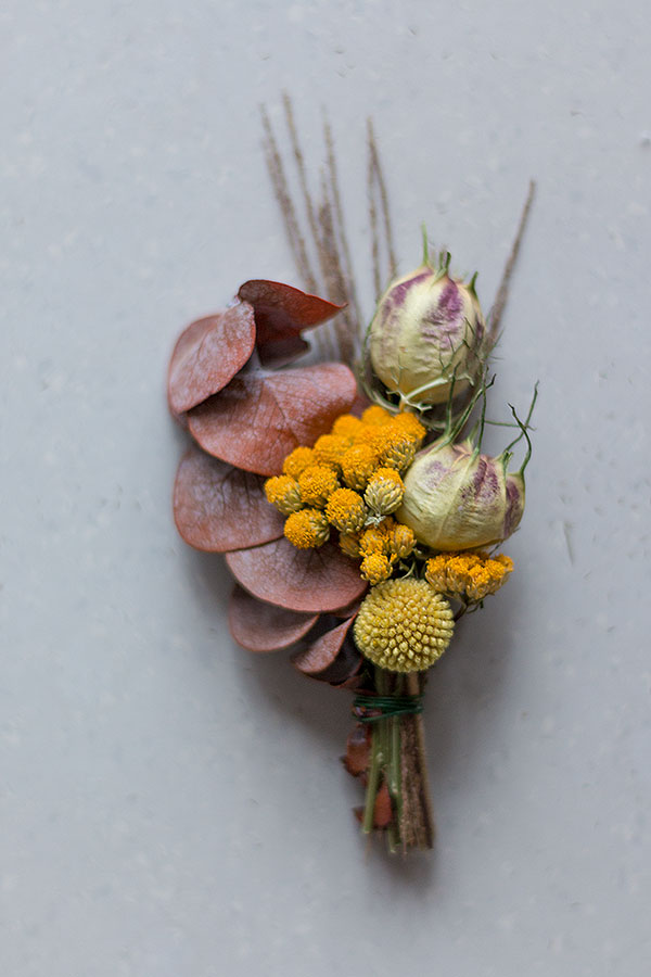 Craspedia = ca. 6 cm – 7 cm - Aus den Trockenblumen kleine Sträuße binden. Dabei als Erstes das Besengras in die Hand nehmen. Darauf den Eukalyptus legen. Nun 2 – 3 Nigella und 2 – 3 Schafgarbe abwechselnd der Größe nach neben dem Eukalyptus anordnen. Unten in der Mitte mit einer Craspedia abschließen. Die Stiele unten mit einem ca. 8 – 10 cm langem Draht fest umwickeln.