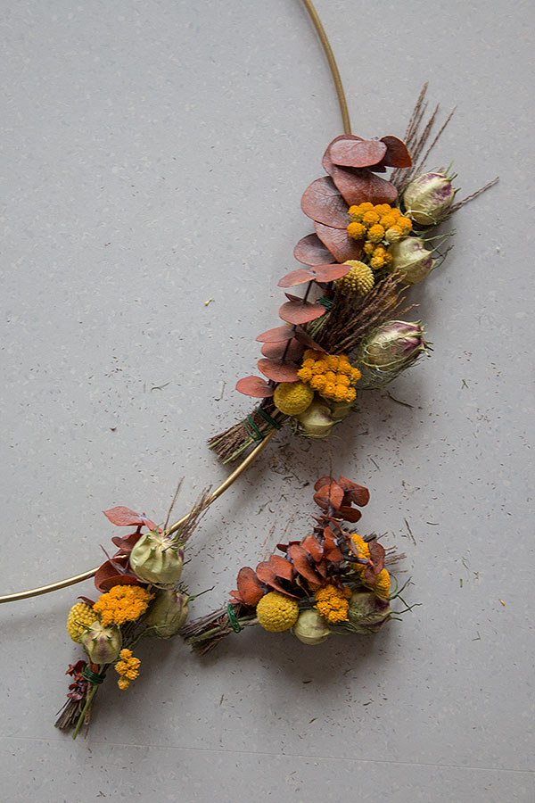 - Kleine Unregelmäßigkeiten in den einzelnen Sträußen lockern das Gesamtbild des DIY Kranzes auf und sind erwünscht.