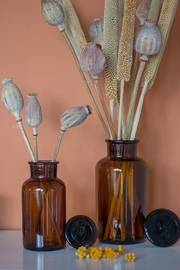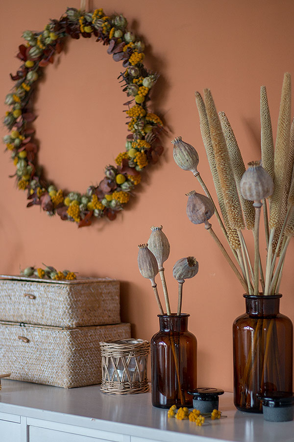 Da der Kranz kein großes Gewicht besitzt, habe ich nur einen Nagel in die Wand geschlagen und ihn dort aufgehängt. Richtig gut zur Geltung kommt er, wenn farblich ähnliche Dekoartikel um den Trockenblumenkranz auf einer Kommode dekoriert werden. Um den natürlichen Look des Kranzes zu unterstützen, habe ich meine naturfarbenen Boxen (ähnliche gibt es bei DEPOT) aus dem Badezimmer zweckentfremdet und auf diesen, ein paar vom Kranzbinden übriggebliebene Trockenblumen, dekoriert. In die stylischen Apothekergläser passt perfekt das Blumenbündel Blaba in Kombination mit ein paar Mohnkapseln. Diese am besten auf unterschiedliche Längen kürzen.