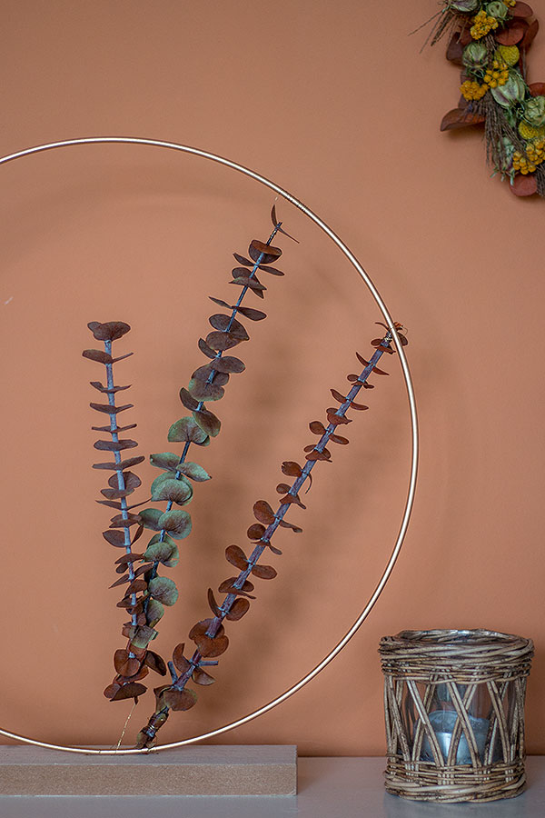 Einen weiteren Metallring, der auf einem Fuß angebracht ist, habe ich mit ein paar übriggebliebenen Eukalyptusblättern, mithilfe von goldfarbenem Wickeldraht , bestückt. Einfach den Draht oben und unten um den Eukalyptus und den Metallring wickeln. Schlicht & einfach, aber dennoch ein Eyecatcher!
