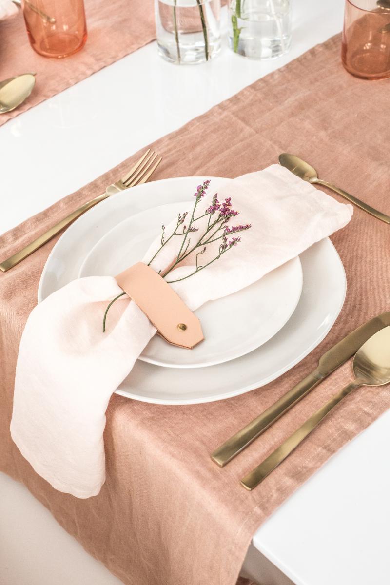 Passend zum Lederband der Vase gibt es auch Serviettenringe, die mit Natürlichkeit bestechen.