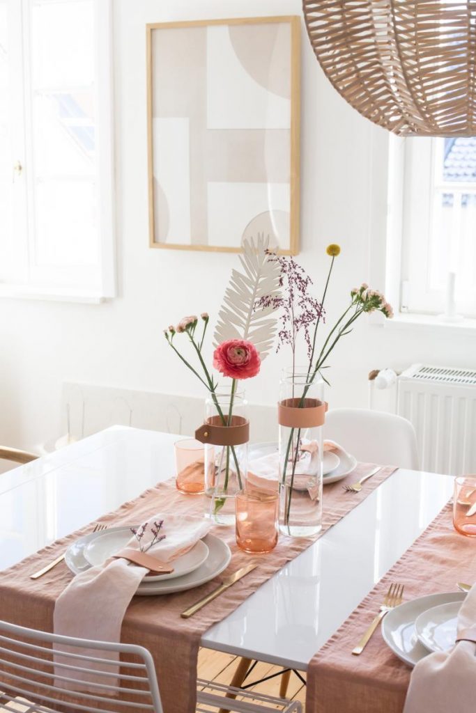Die Farnblätter sind so leicht, dass ihr sie auch mit einem schönen Washi Tape an die Wand kleben könnt. In unterschiedlichen Höhen aufgehängt sind sie ein echtes Wandhighlight und eine tolle Alternative für Poster oder Bilderrahmen. Auch in den schönen Glasvasen mit dem Lederband in Peach kommen die Farnblätter super zur Geltung.