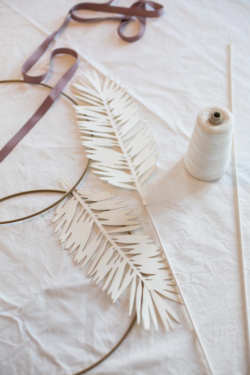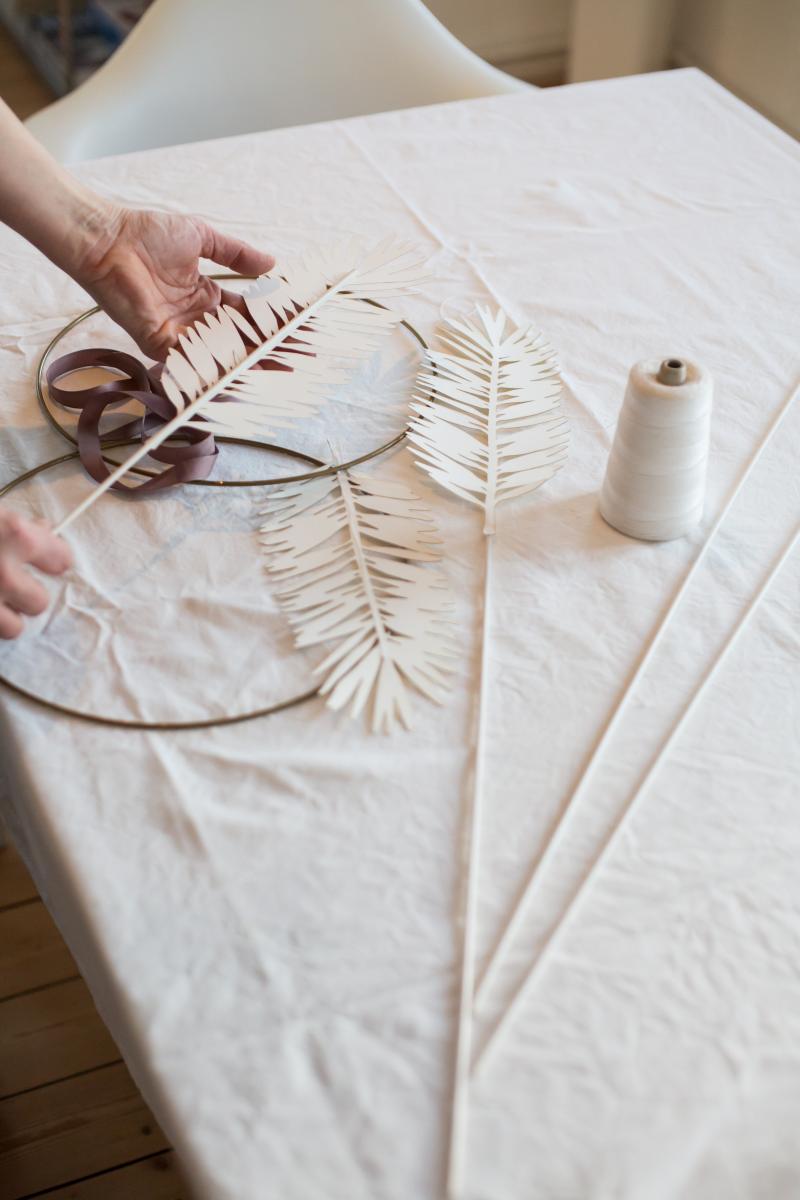 - Kürze im ersten Schritt den Stängel der Farnblätter und binde sie in entgegengesetzter Richtung mit dem weißen Faden an den Ring. Für zusätzliche Stabilität kannst du auch etwas doppelseitiges Klebeband auf der Rückseite des Blatts anbringen und an den Ring kleben.