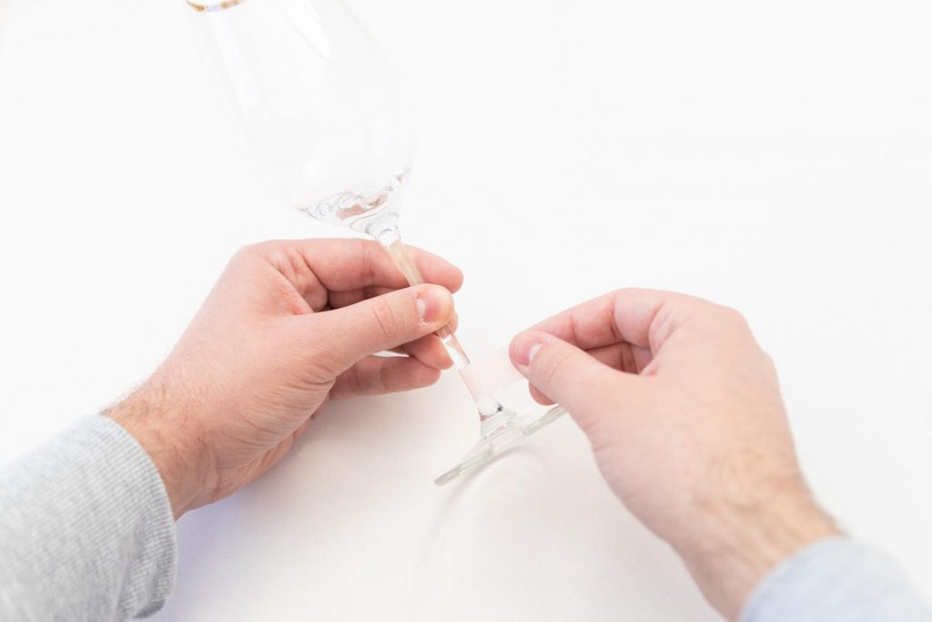 - Im ersten Schritt klebst du den Stiel deines Weinglases mit einem Streifen Washi Tape ab, damit dort später keine Farbe hinkommen kann.