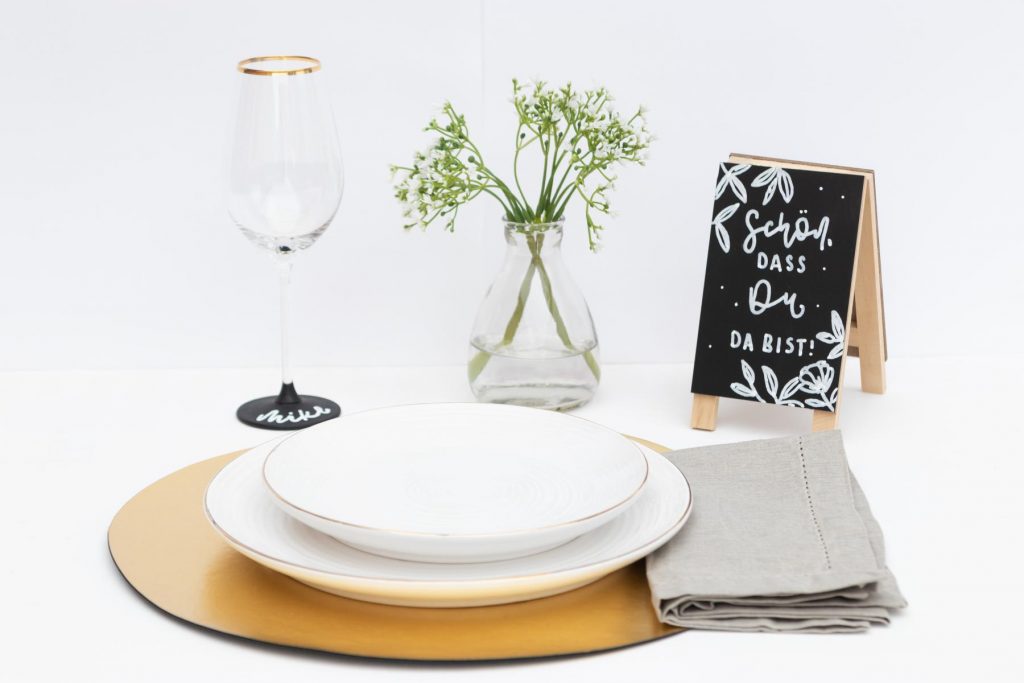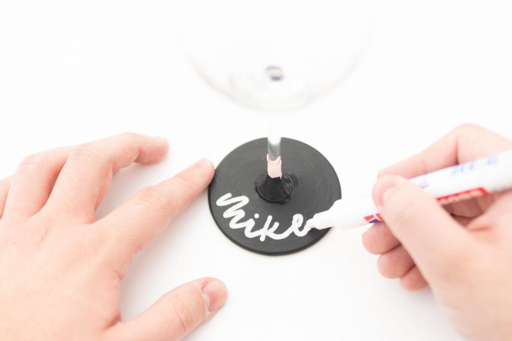 - Sobald die Farbe getrocknet ist, kannst du mit einem Kreidemarker die Namen deiner Gäste auf den Fuß schreiben. Hier kannst du dich an der Rundung des Fußes orientieren. Wenn du dir unsicher bist, kannst du auch auf einem Skizzenpapier die Namen vorlettern.