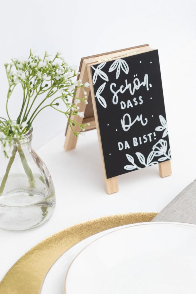Mit kleinen Kreidetafeln kannst du tolle Botschaften auf den Tisch stellen oder die Namen der Gäste, die an einem Tisch sitzen, notieren. Durch die Klappfunktion können alle Gäste die Tafel sehen und fühlen sich auf deiner Feier willkommen.