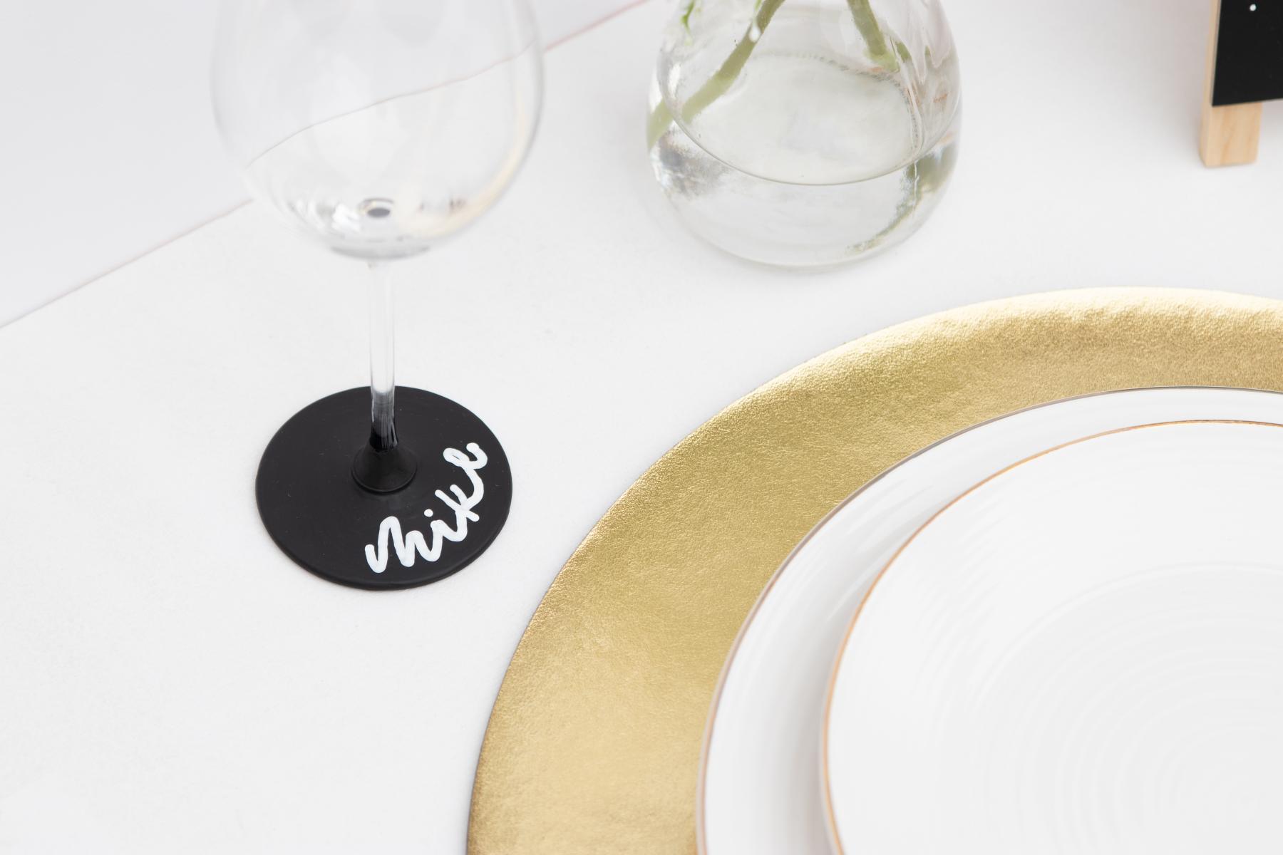 - Sobald die Farbe getrocknet ist, kannst du mit einem Kreidemarker die Namen deiner Gäste auf den Fuß schreiben. Hier kannst du dich an der Rundung des Fußes orientieren. Wenn du dir unsicher bist, kannst du auch auf einem Skizzenpapier die Namen vorlettern.