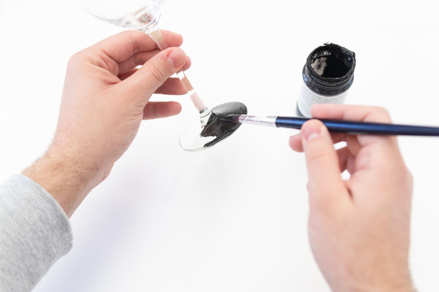 - Wenn dein Streifen klebt, kannst du mit einem Pinsel und der Tafelfarbe den Fuß deines Glases anmalen. Achte dabei darauf, dass du nicht über das Tape malst. Lasse das Glas anschließend am besten über Nacht trocknen.