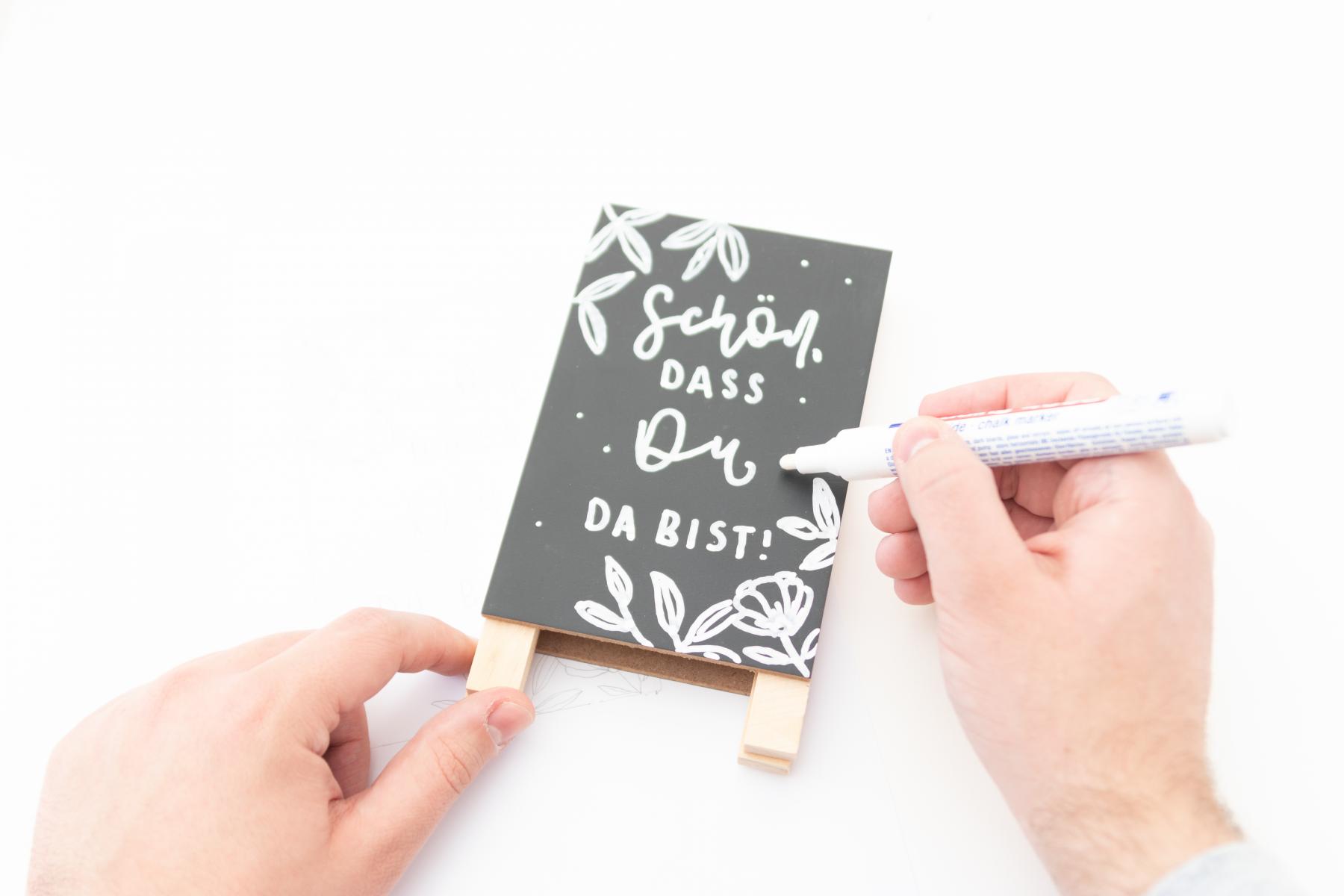 - Wenn du mit deiner Skizze zufrieden bist, kannst du das Lettering und die Illustrationen auf die Tafel mit einem Kreidemarker übertragen. Achte dabei darauf, dass du mit deinem Handgelenk die Schrift nicht verwischst. Am besten ist es, wenn du mit dem Lettering beginnst und danach die Blumen/Blätter malst.