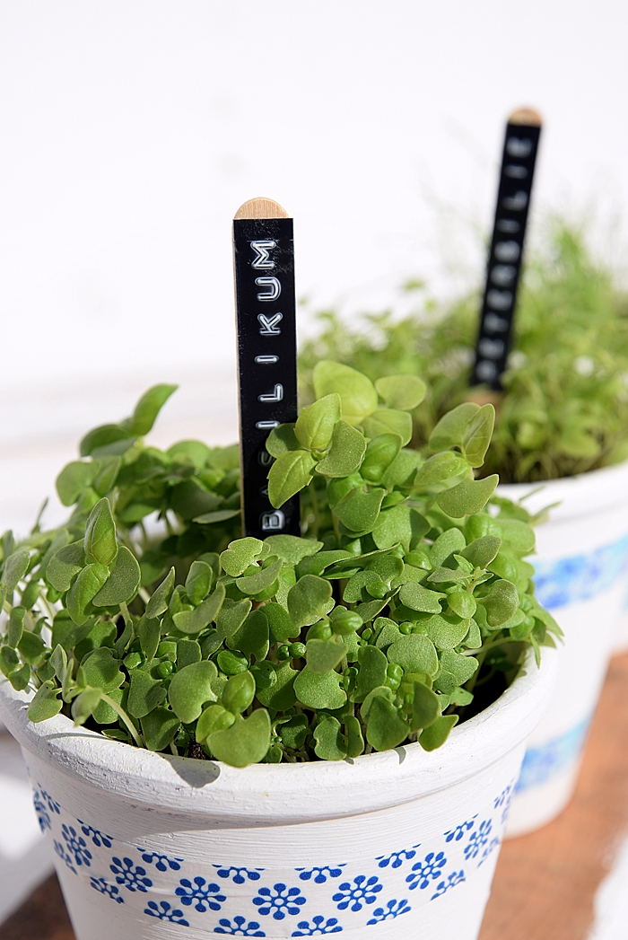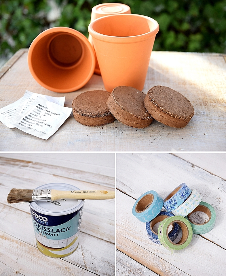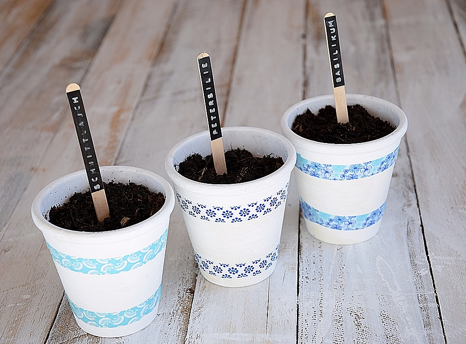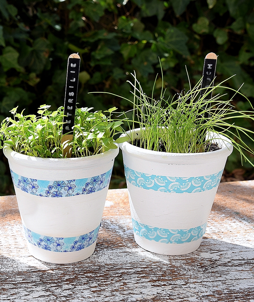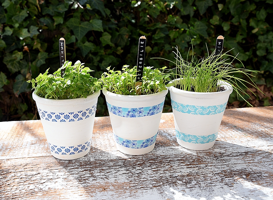 Die kleinen Tontöpfe lassen sich natürlich auch individuell gestalten. Meine drei Kräutertöpfe habe ich mit weißer Kreidefarbe gestrichen und mit bunt gemusterten Washi-Tapes verziert. Ihr könnt die Töpfe aber auch mit Stoffresten oder Servietten bekleben. Ganz wie es euch gefällt.