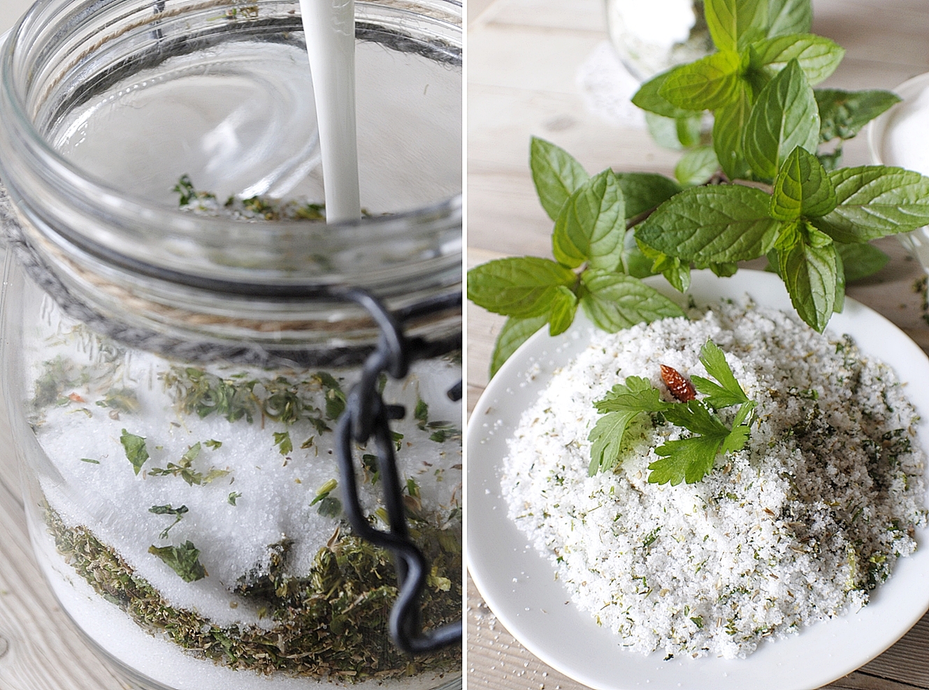 Aufbewahrt in Einmachgläsern hält dieses selbstgemachte Kräutersalz bis zu einem Jahr frisch.