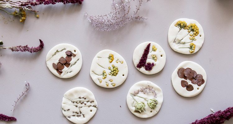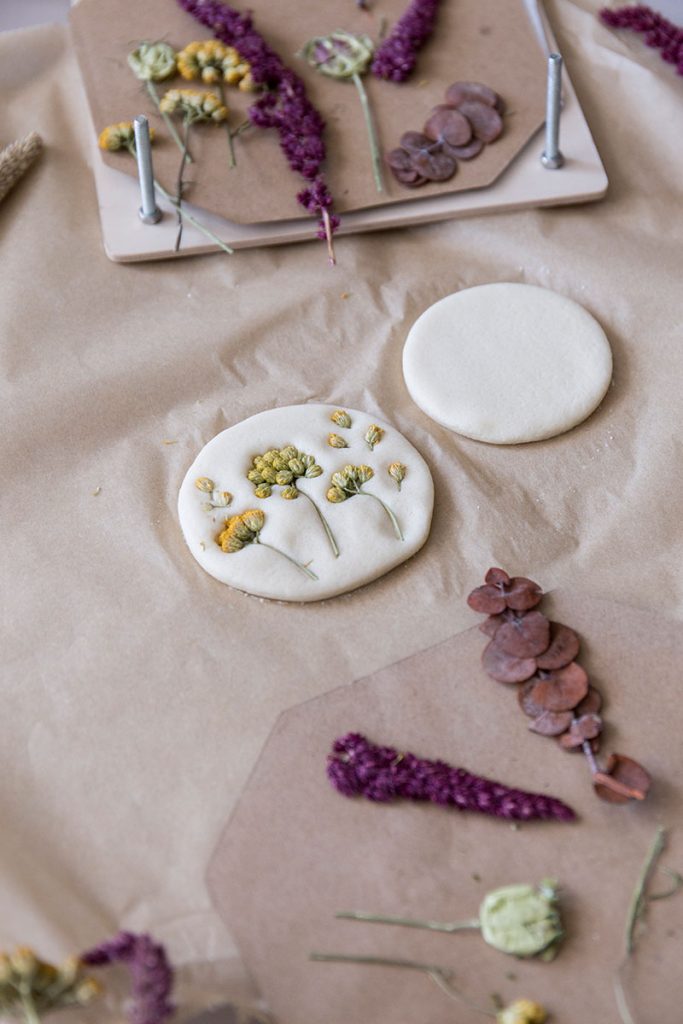 - Jetzt die gepressten Trockenblumen auf den Salzteigkreisen anordnen und etwas festdrücken. Man kann auch mit der Ausrollhilfe nochmals zart über den Kreis rollen und die Trockenblumen so festdrücken.