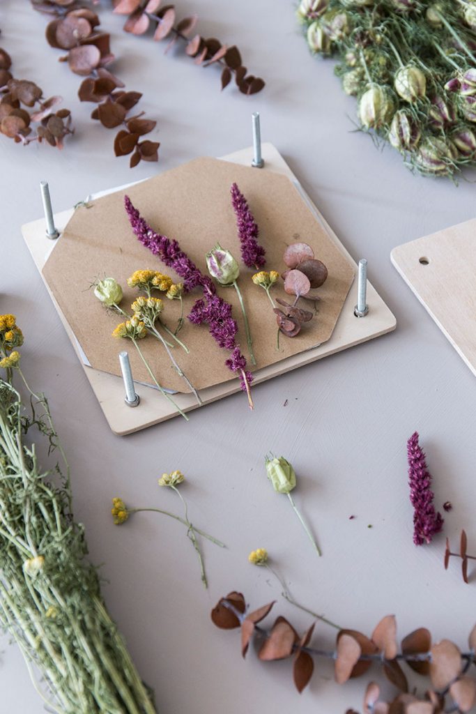 - Die Trockenblumen in einer Blumenpresse oder zwischen Büchern pressen.