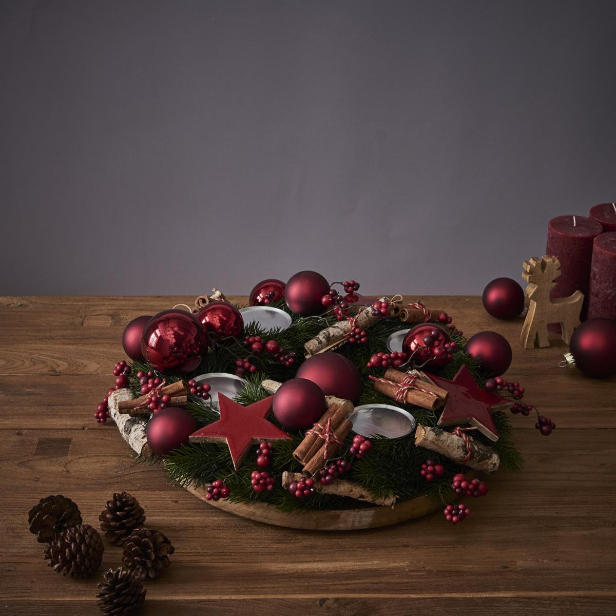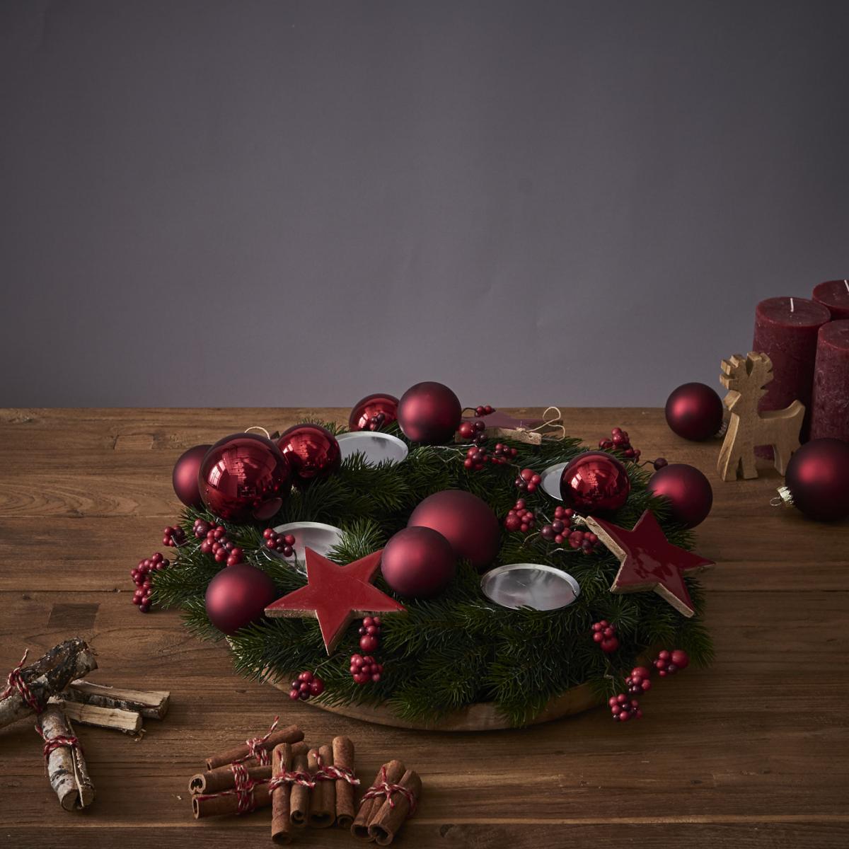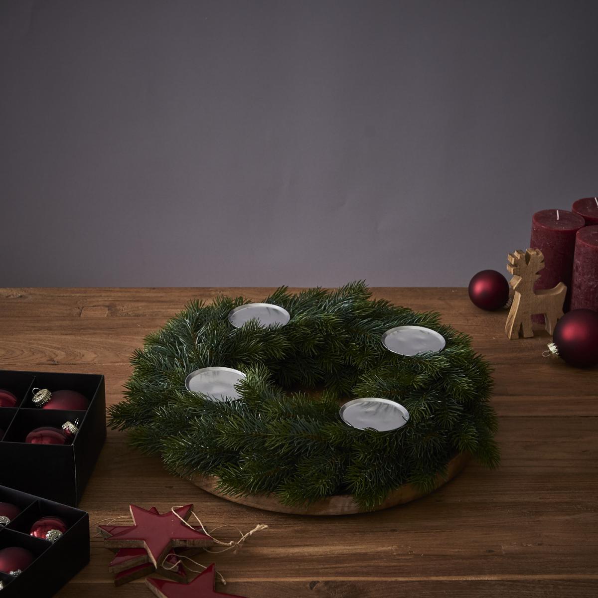 - Den Kranz auf das Holztablett legen und die Tüllen auf den Kranz stecken.