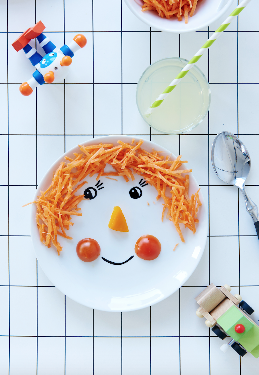 Lass deiner Kreativität freien Lauf! Schnapp dir den Pinsel und male ein Gesicht in die Mitte des Tellers. Ich habe mich für schwarze Farbe entschieden, dadurch kommt das Gemüse als Kontrast richtig schön zur Geltung.