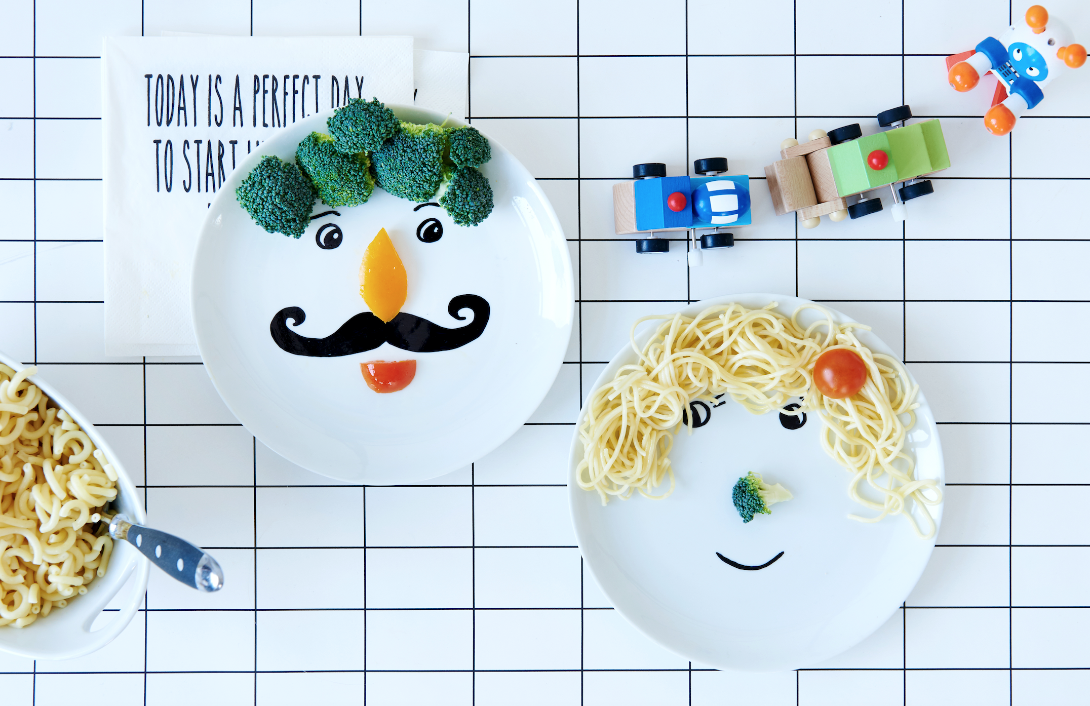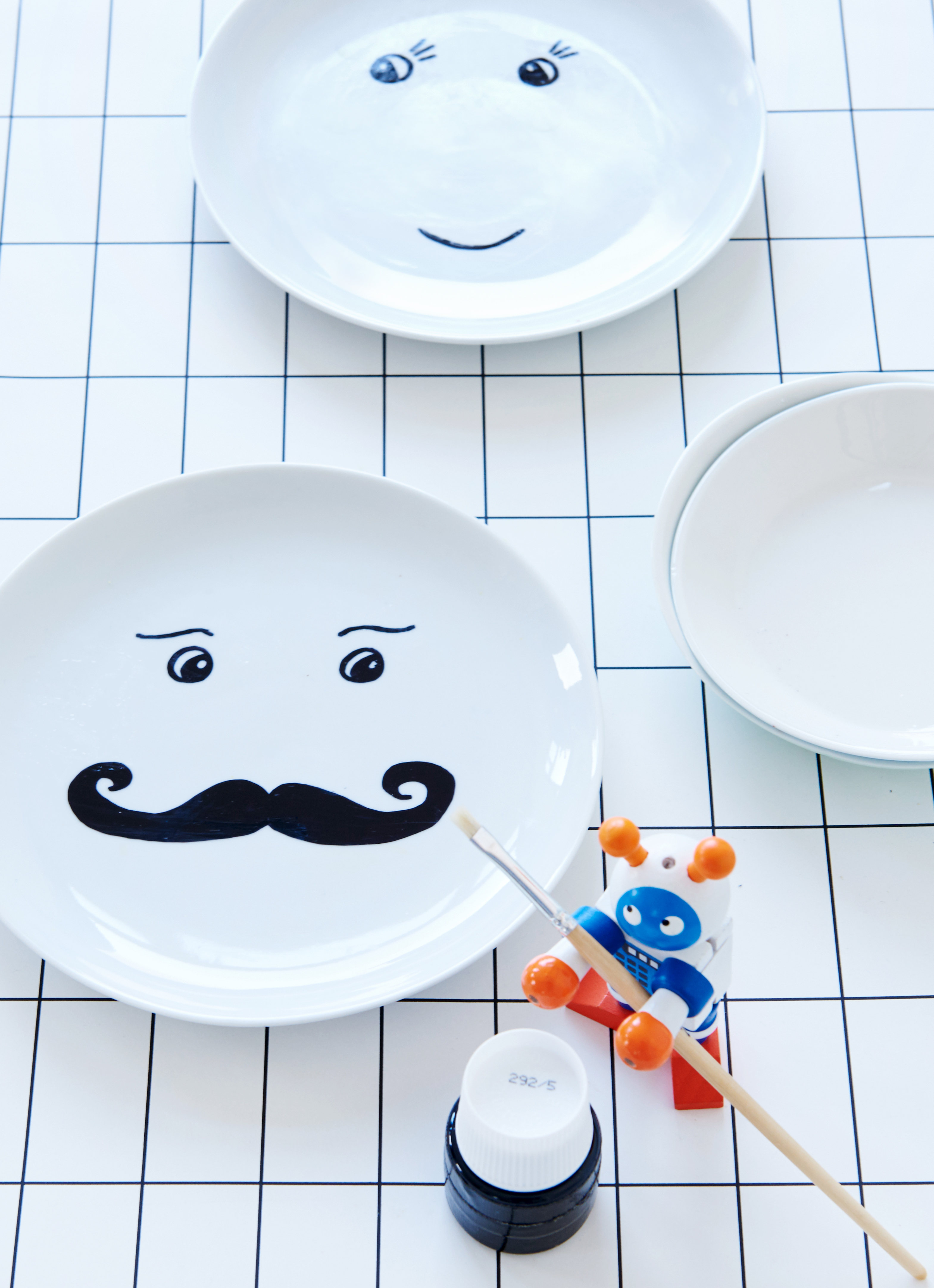 Wie soll das denn bitte funktionieren? Mit etwas Farbe und einem weißem Teller malen wir lustige Gesichter auf das Porzellan und verzieren sie mit einer ordentlichen Portion Gemüse.