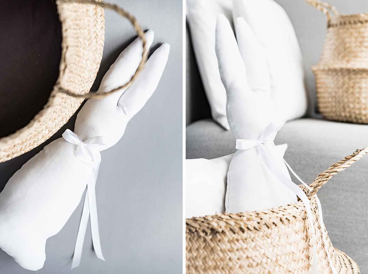 - Auch Kissen sollten sich festtagsfein machen. Bindet einfach eine Schleife aus Geschenkband um den Hals des Hasenkissens.
