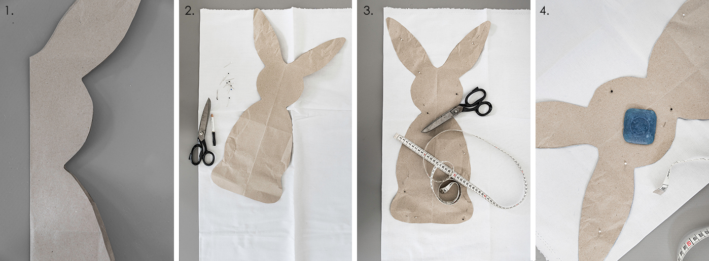 - Schneidet mit einer Stoffschere, die doppelte Hasensilhouette inkl. Nahtzugabe aus. Entfernt vorsichtig die Schablone und steckt gleichzeitig die Stofflagen wieder zusammen.