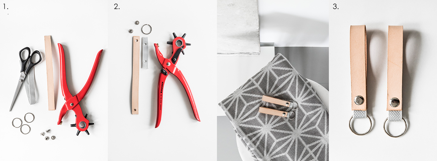 - Für Schlüsselanhänger braucht Ihr Lederriemen, Gurtband, Hülsenschrauben (Buchbindeschrauben), Schlüsselringe, eine Schere und eine Lochzange