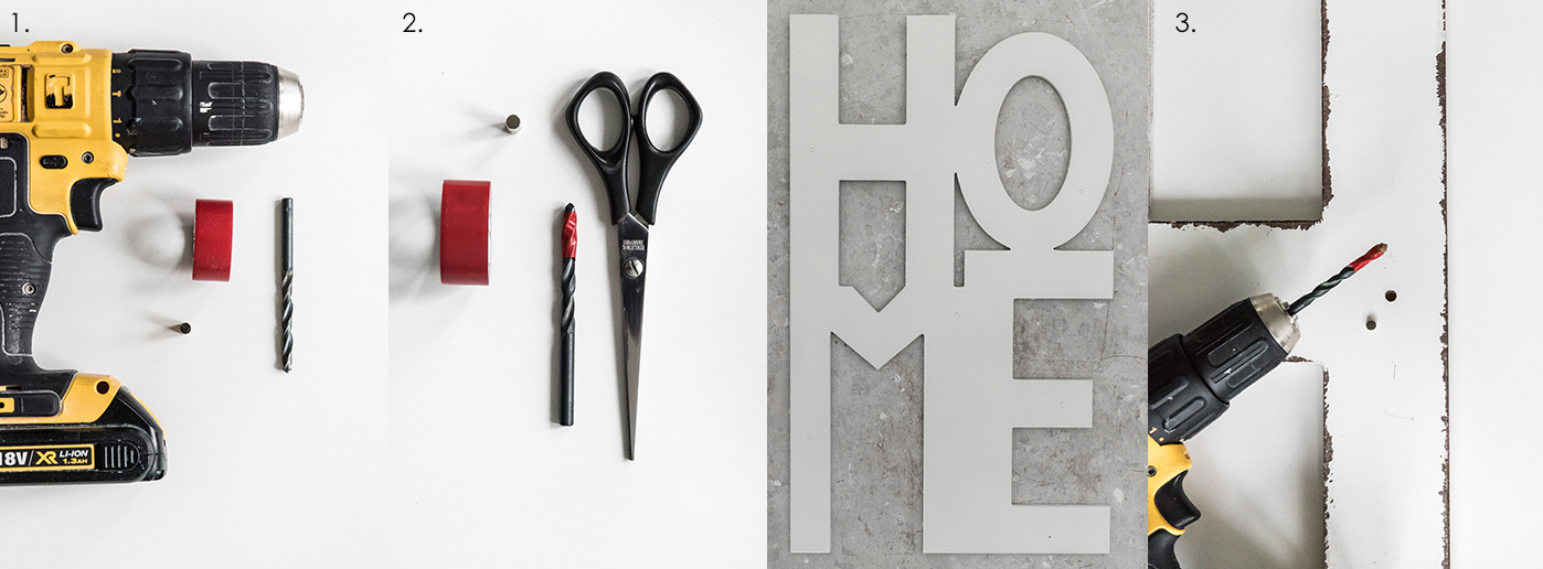 - Zuallererst müsstet Ihr Euch den Schriftzug HOME von DEPOT besorgen, außerdem braucht Ihr noch kleine Powermagnete, eine Bohrmaschine, einen passenden Bohrer, Klebeband und Alleskleber