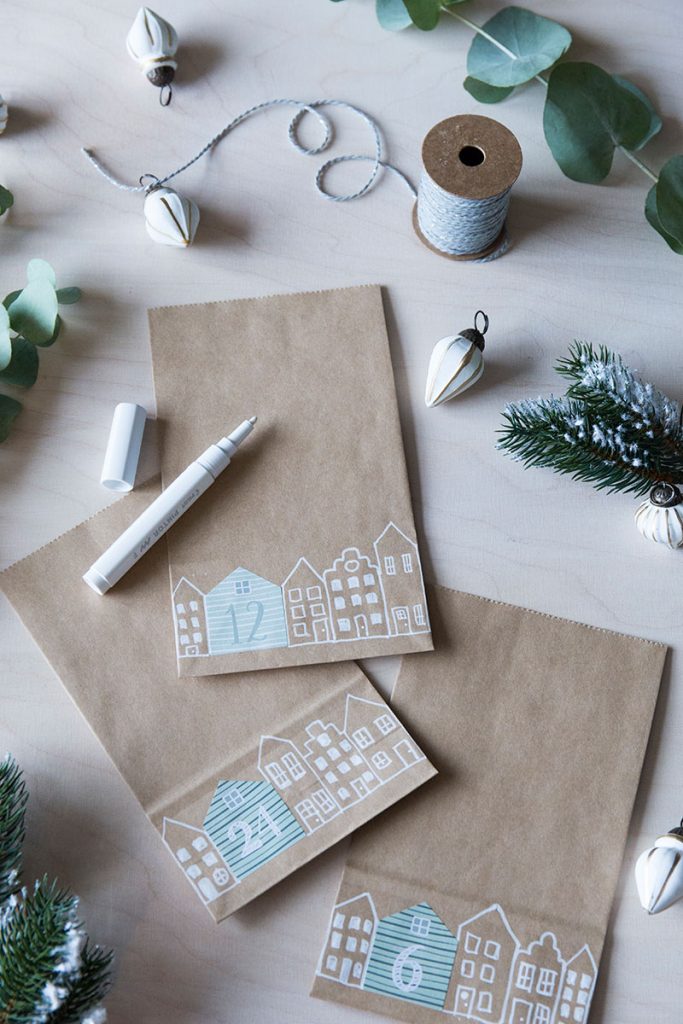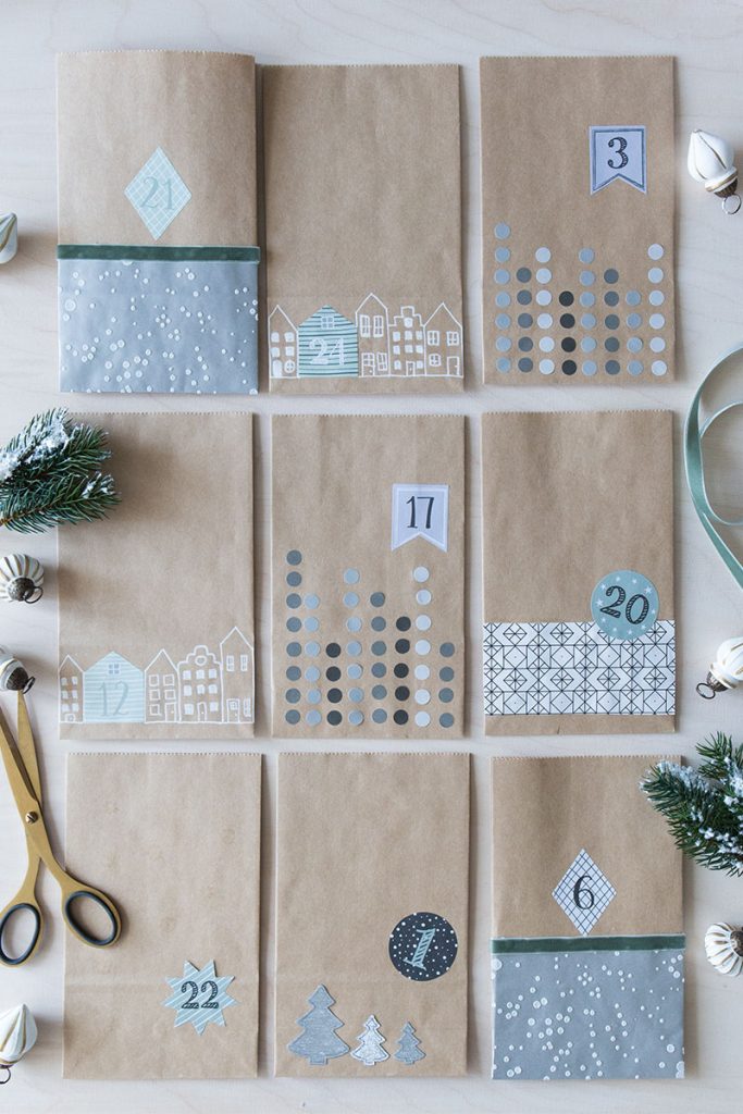 - Selbstklebenden Adventskalenderzahlen auf den Tüten verteilen