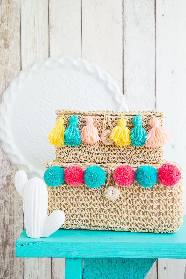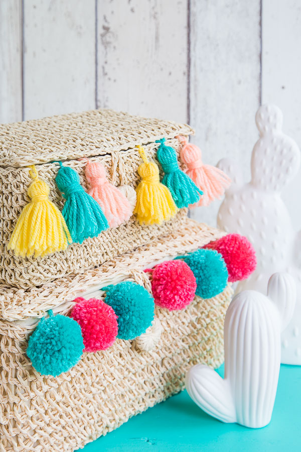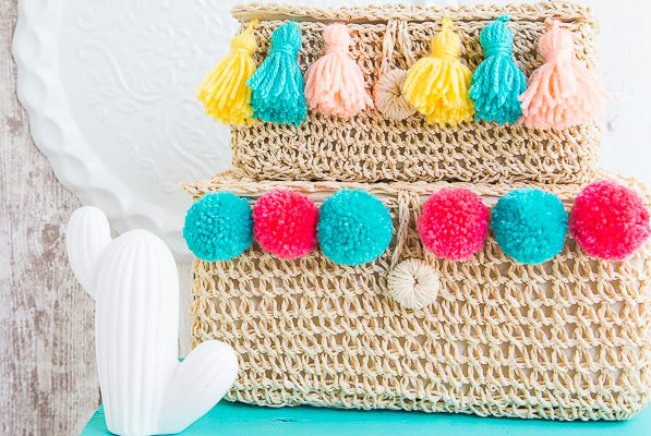 Ihr könnt eigentlich fast alles mit Pom Poms ausstatten, egal ob Taschen, Körbe, Kissen oder Decken (wie ihr hier nach basteln könnt). Sie verbreiten überall diese gute Laune. Ich mag die bunten Anhänger besonders gern in Kombination mit Bast oder fröhlich bunten Stoffen. Bei den Körben von DEPOT habe ich die Quasten einfach am Rand des Korbes verknotet. Wie Ihr diese ganz einfach nachmachen könnt, erkläre ich weiter unten.