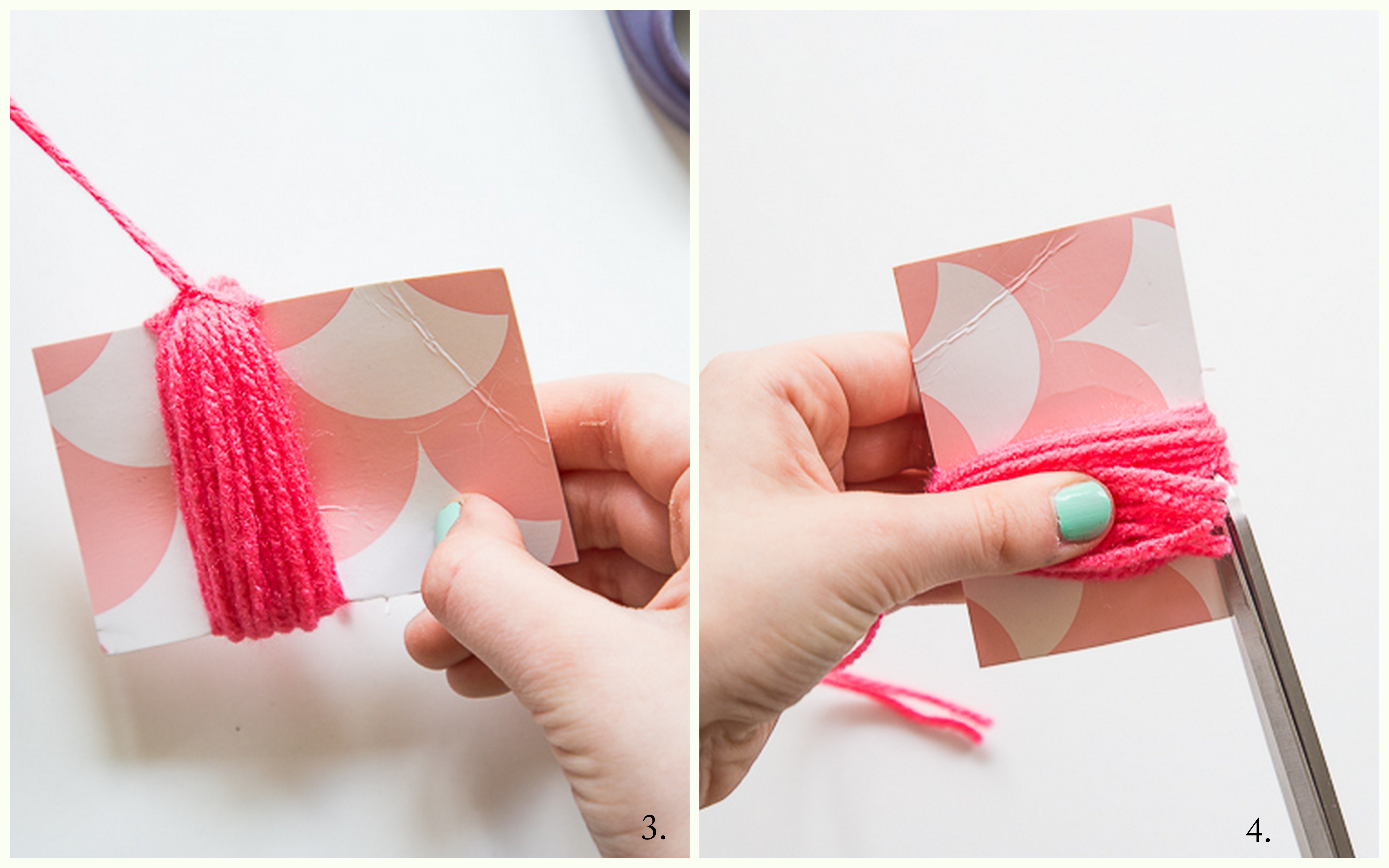 1. Zuerst schneidet Ihr Euch ein Stück Pappe in den Maßen 6 x 8 cm zurecht. Wickelt den Wollfaden mehrmals dick um die Pappe.