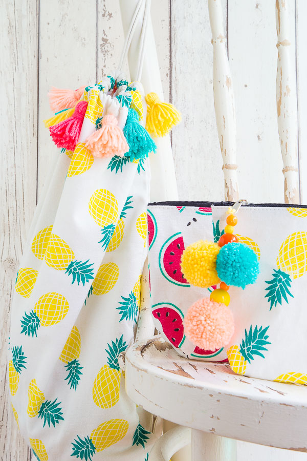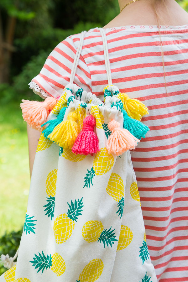 Bei dem Umhängebeutel habe ich die einzelnen Quasten mit Hilfe einer dicken Nadel durch den oberen Rand des Beutels gezogen und von Innen verknotet. Für die Pom Poms bekommt ihr in jedem gut ausgestatteten Bastelladen Pom Pom-Maker. Damit geht es ganz schnell und einfach.