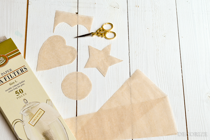 - Aus den Teefiltern schneidet Ihr Euch mit einer Schere die gewünschten Formen wie Sterne, Kreise oder Herzen, Wolken, Dreiecke oder… Eurer Phantasie sind keine Grenzen gesetzt.