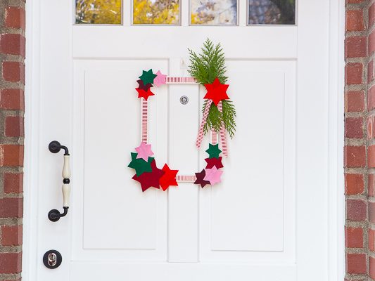 Im Herbst und Winter weht schon mal etwas stärker der Wind, aber auch beim Öffnen und Schließen der Tür ist es nicht schön bzw. schon etwas störend, wenn der Kranz sich an der Tür geräuschvoll klappernd hin und her bewegt. Dem könnt Ihr vorbeugen, indem Ihr ihn auf der Rückseite mit etwas Maskingtape oder Klebestreifen an der Tür fixiert.
