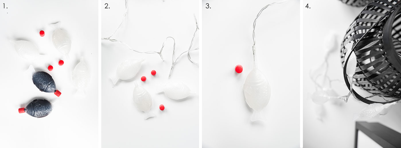 Wir verwenden die Suhsifische nun als Lichtschirme für die DIY-Lichterkette, ein sehr einfaches Upcycling.