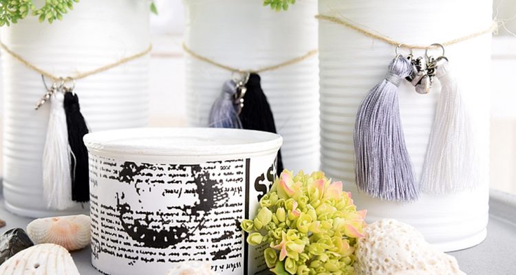 Herkömmliche Metalldosen, ein wenig weiße Farbe, Zierquasten von DEPOT – und fertig sind unsere ganz individuellen, eleganten Dosen-Vasen.