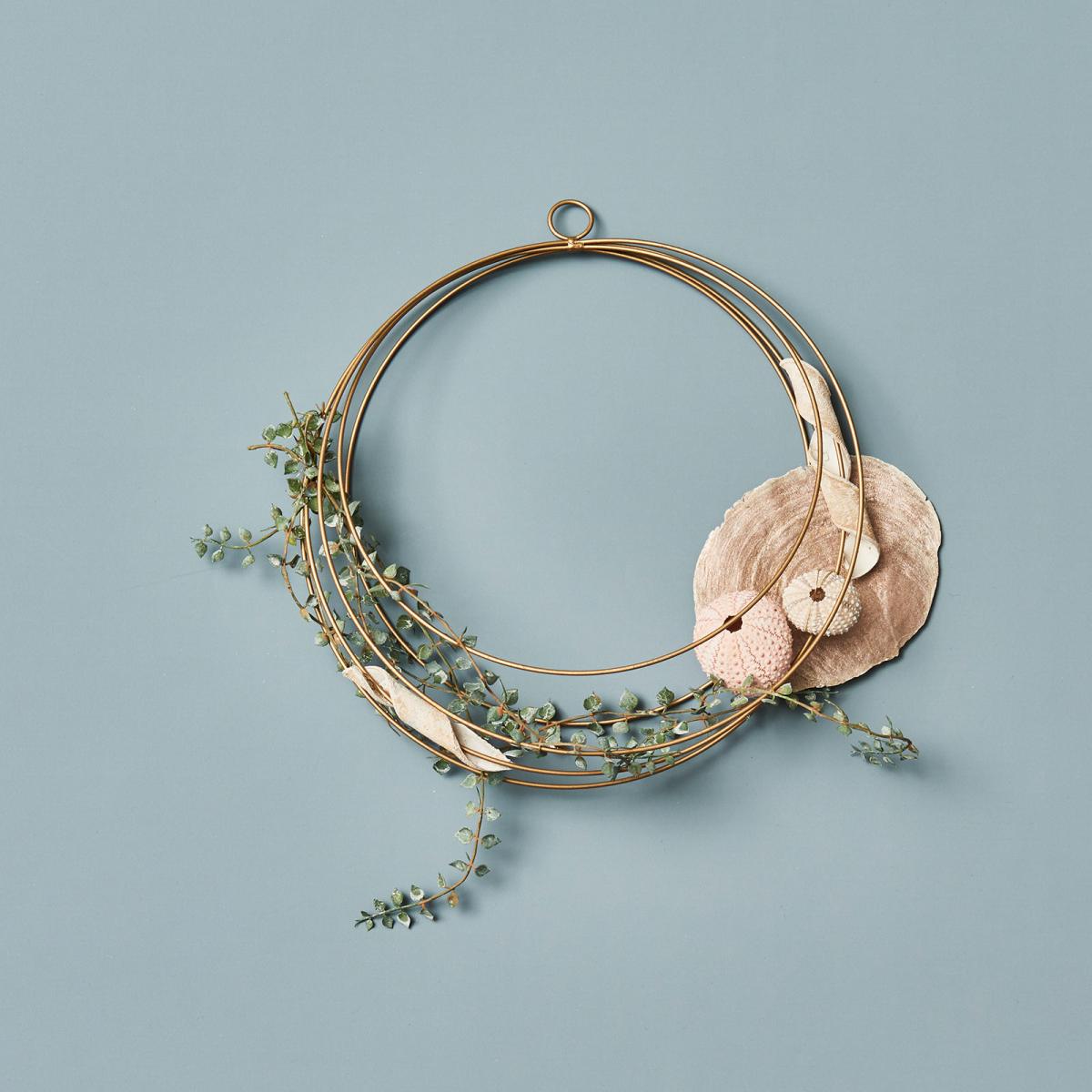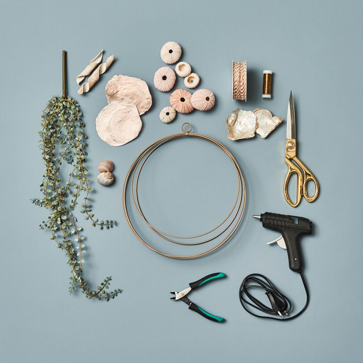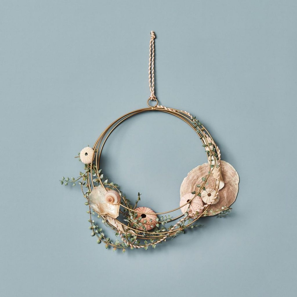 - Danach kommen die Muscheln und anderen Meereshighlights dran: Klebe sie nacheinander mit Heißkleber an den Kranz oder an die Blättergirlande.