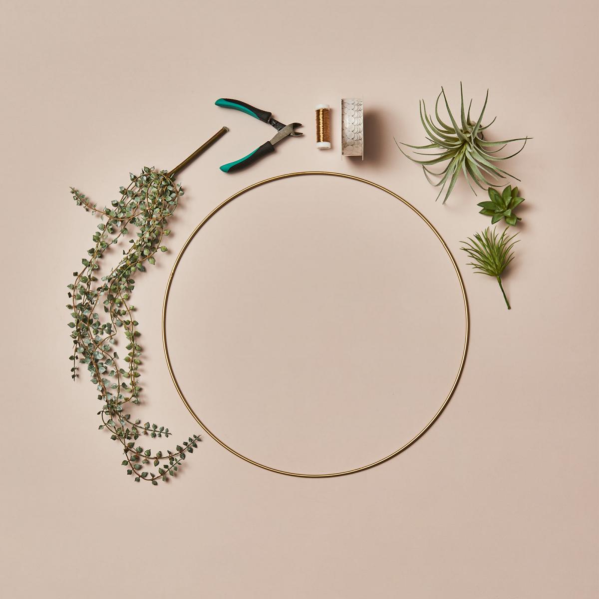 - Kürze den Stiel der Girlande und lege sie anschließend zwischen die Ringe. Befestige sie eventuell mit Heißkleber.