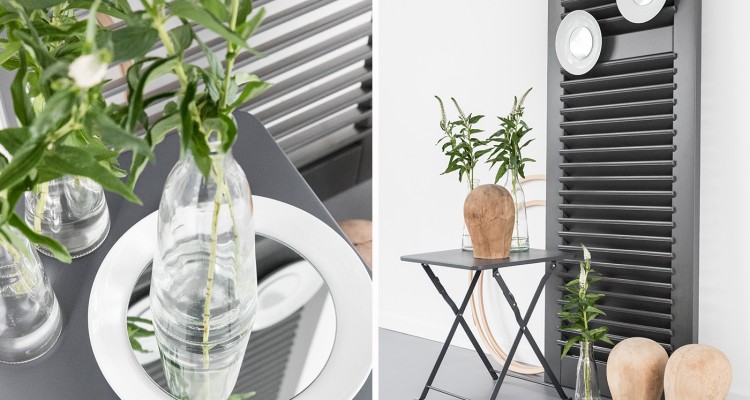 Wenn die Tellerspiegel fertig sind, können sie endlich zum Einsatz kommen. Meine praktischen Helfer habe ich an eine Klapplade gehängt, die nun mit den Tellerspiegeln einen Wandbereich vollflächig betont. Solche Klappläden oder Lamellentüren bekommt Ihr in jedem Baumarkt. Im Rohzustand können sie noch mit einem passenden Lack gestrichen werden. Ein Klapptisch von DEPOT, der eigentlich als Beistelltisch für die Terrasse oder den Balkon gedacht ist, dient als Ablage- oder Dekofläche. Blumen in Flaschenvasen von DEPOT sind ein feines Empfangskomitee. Accessoires aus Holz, hier alte Perrückenköpfe und Turnreifen, sorgen für optische Wärme.