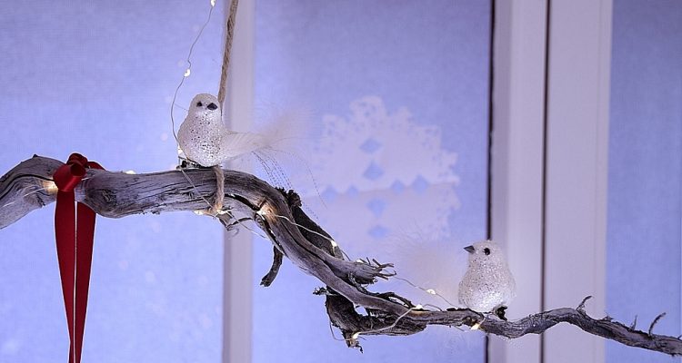 - Zum Schluss könnt ihr noch kleine Vögel auf eurem Ast platzieren. Meine weißen Vögel stammen ursprünglich von einer Hochzeitsdeko. Ich finde, sie passen wunderbar zur restlichen Weihnachtsdeko.