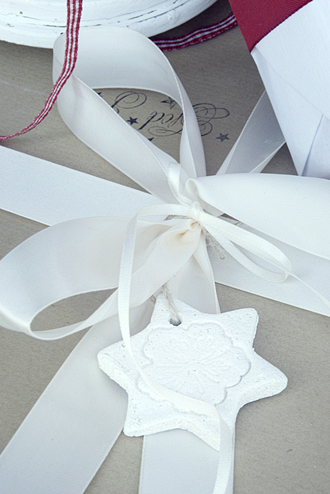 Da ich unbedingt weiße Geschenkanhänger wollte, habe ich sie nach dem Trocknen mit einem Edding-Spray lackiert. Dieser Spray trocknet extrem schnell und kann für nahezu alle Oberflächen verwendet werden, sowohl im Innen- als auch im Außenbereich. Das Muster, das ihr auf diesem Stern seht, habe ich mit einem Spitzenstoff, den ich auf die noch nicht getrockneten Salzteigformen aufgelegt und mit der Hand leicht angedrückt habe, erzeugt.