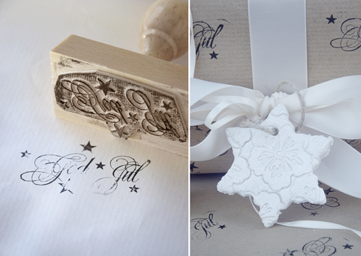 „God Jul“, so wünschen sich die Menschen in Schweden „Frohe Weihnachten“. Mit einem Stempel lassen sich wunderschöne Motive und Schriftzüge auf das Packpapier stempeln. Falls ihr keinen Stempel zur Verfügung habt, könnt ihr auch mit einem Stift weihnachtliche Grüße oder andere Motive aufs Papier aufmalen.