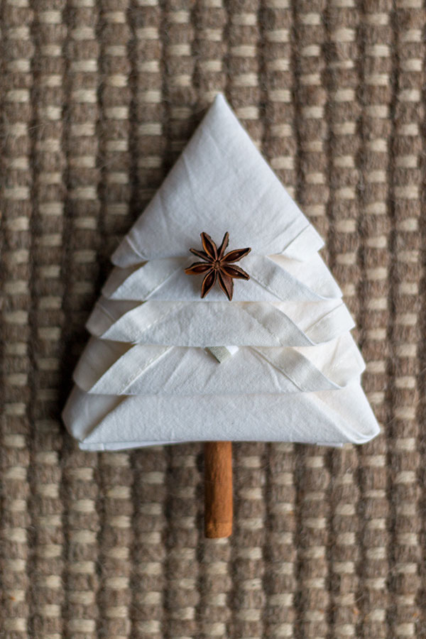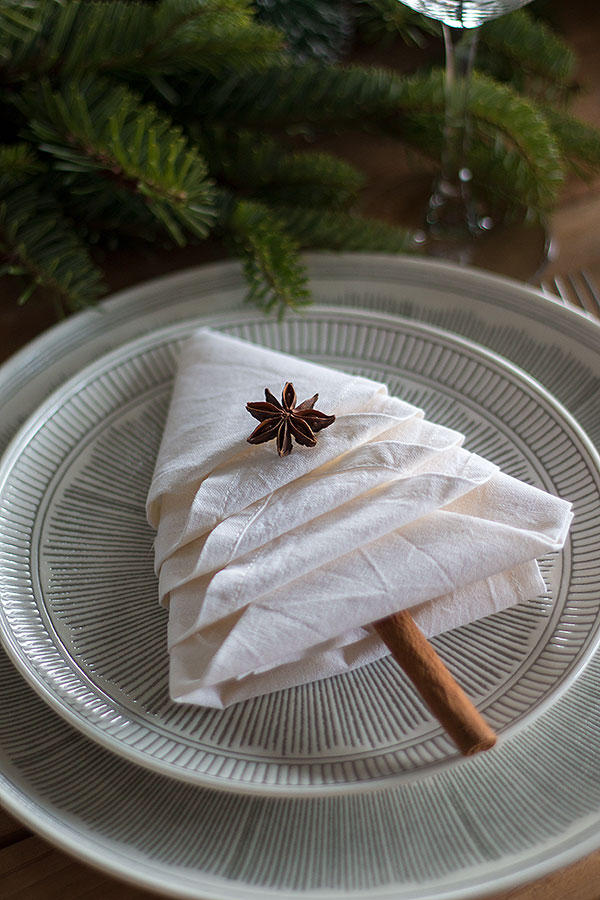 - Eine Zimtstange unten in die Serviette schieben. Sie stellt den Baumstamm dar. Auf das obere Drittel einen Sternanis als Verzierung legen.
